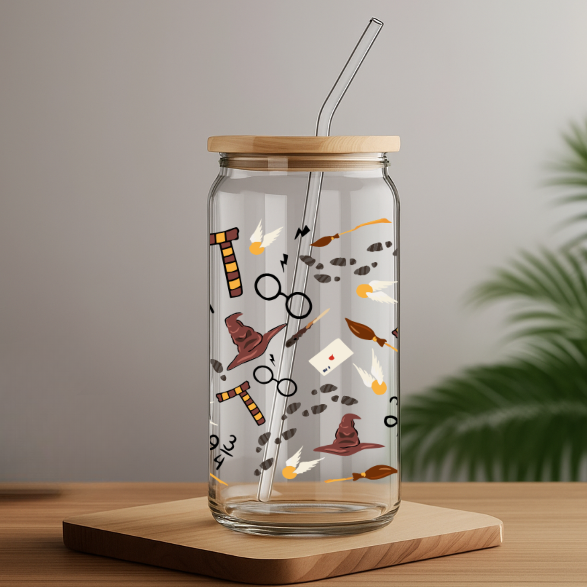 Obohaťte svou každodenní rutinu o kouzelný nádech s naší stylovou skleničkou s bambusovým víčkem a skleněným brčkem, zdobenou motivy ze světa kouzel. Tento praktický a ekologický doplněk je ideální nejen pro fanoušky, ale i pro ty, kteří hledají stylový a udržitelný způsob, jak si vychutnat své oblíbené nápoje.