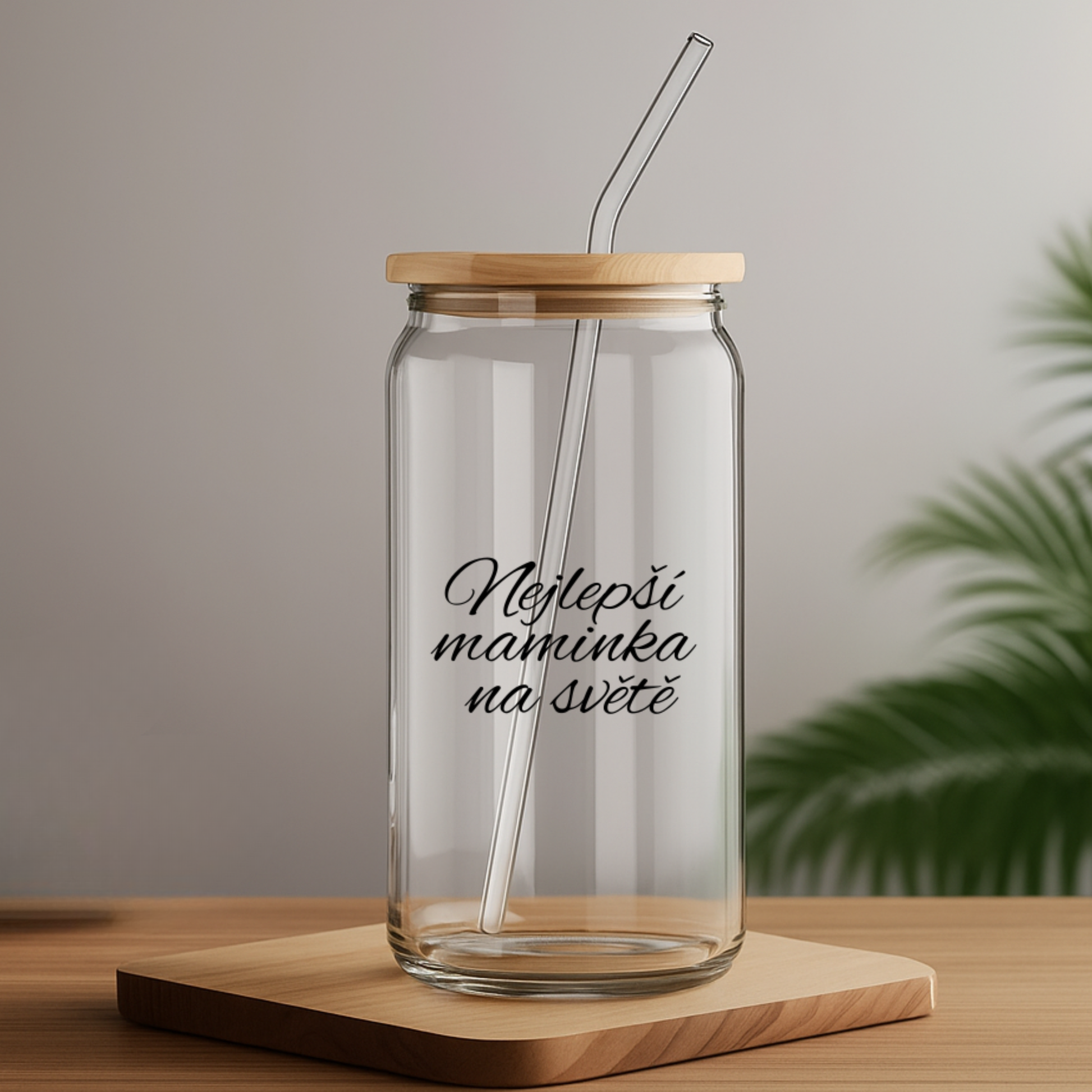 Originální sklenička 500 ml z čirého skla s jemným a vkusným potiskem textu „Nejlepší maminka“.