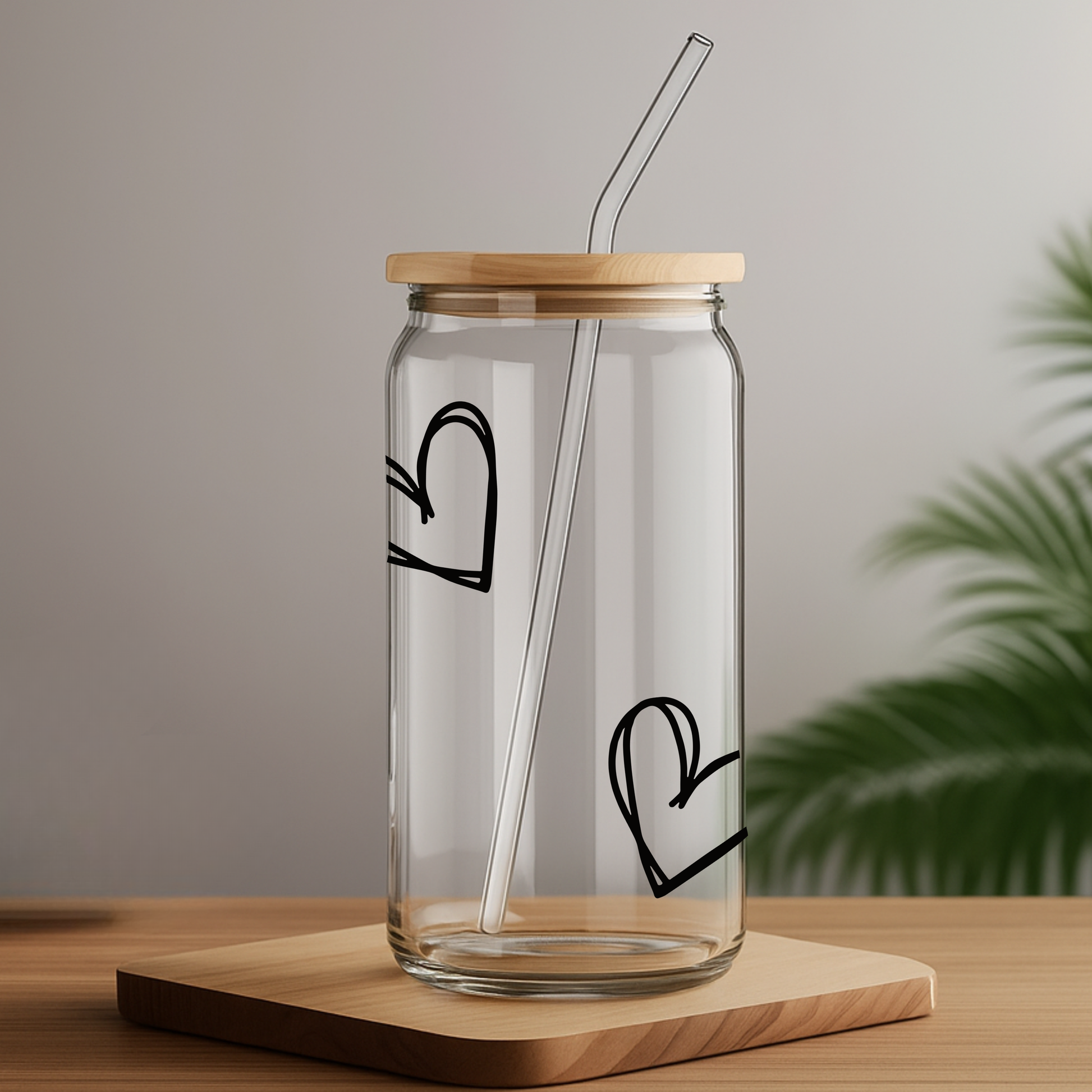 Sklenička - srdíčková s bambusovým víčkem a brčkem (500 ml)