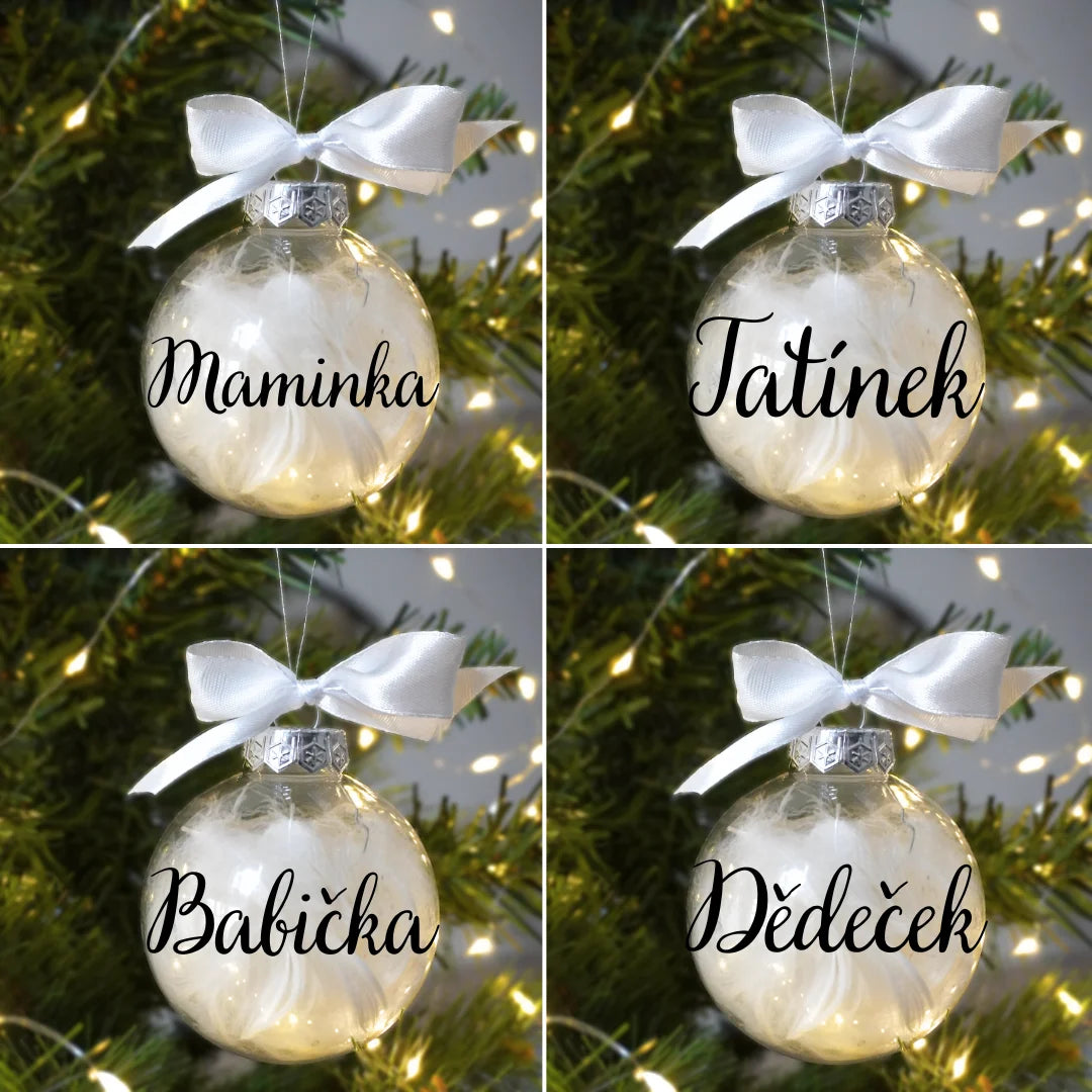 Vytvořte si jedinečný a osobní vánoční stromek . Tato plastová ozdoba o průměru 8 cm je plněná jemným bílým peřím , doplněná o bílou mašli a hlavně —